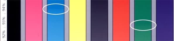 Рассмотрим результат внимательнее. Градиентные полосы гладкие, но имеют проблемные зоны в районе 92–95%. Здесь заметны рывки, особенно сильно на голубом и зеленом. Печать градиентов начинается в промежутке с 3% (синий) по 7% (желтый). От 0% до 3% бумага остается не тронутой.