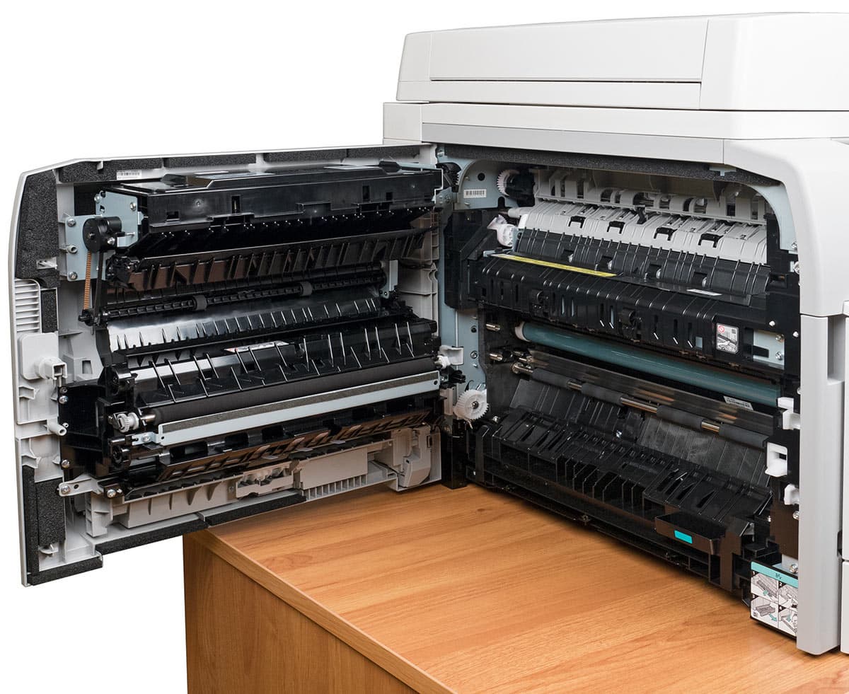 Левая половина фронтальной панели — это дверца, за которой скрываются места установки тубы с тонером и блока барабана. Вся левая стенка тоже является дверцей, открывающей доступ к тракту прохождения бумаги при каких-либо неполадках с подачей. В большинстве случаев ее не обязательно открывать на 90 градусов, но иногда может потребоваться и полное ее открытие, поэтому слева лучше сделать запас свободного пространства даже не 35, а 46–47 см.