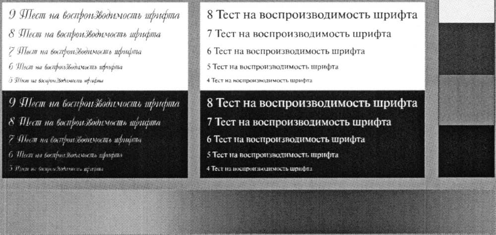 Шкала нейтральных плотностей различима от 2-3 до 93–94 процентов, при печати нормальной и вывороткой шрифты с засечками и без читаются от 5 кегля (разорчивость 4 кегля хуже), декоративный шрифт реально читается лишь с кеглем от 7 и выше, особенно при печати вывороткой.