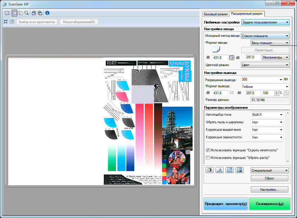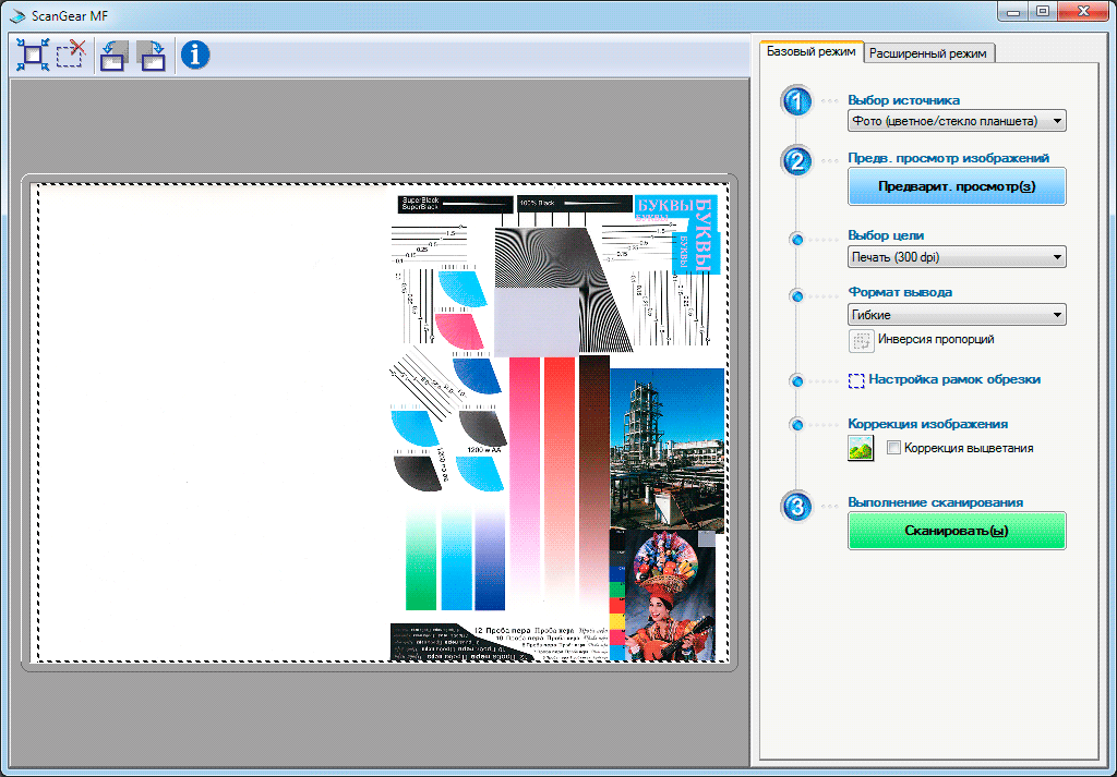 У драйвера ScanGear есть два режима — базовый и расширенный. Первый предназначен для тех, кто не хочет вникать в тонкости процесса, и потому содержит минимум настроек: