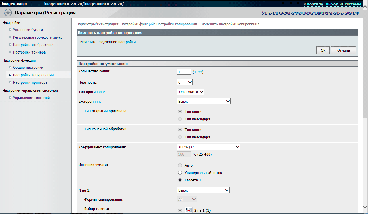 Ниже идет меню с прокруткой, управляющее прочими настройками. На первом экране помещаются наиболее употребимые — плотность, тип оригинала (текст, текст/фото, фото) и управление количеством сторон оригинала и копии. С помошью прокрутки доступны еще семь настроек, включая масштабирование (этот пункт меню называется «Коэффициент копирования», где есть как фиксированные ступени типа «А3 в А4», так и задание с шагом в 1%), режим «N в 1» — 2 или 4 оригинала на один лист копии (здесь же можно выбрать режим «ИД карты», позволяющий, например, скопировать два разворота паспорта на один лист), сортировку, управление копированием книг и т.д. Еще один пункт — пользовательские наборы часто используемых установок, которые можно задавать самостоятельно.