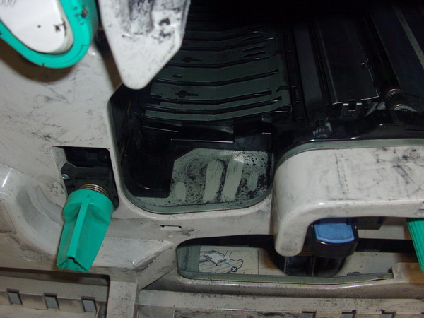 Черная вуаль по всему принтеру — результат работы на перезаправленных картриджах. То, что творится в технике трудно описать даже абзацем. Может, это упущение заправщиков, а может, обычное состояние после заправок? Но нас бы волновало другое — состояние здоровья тех, кто заправляет или работает на перезаправленных картриджах.
