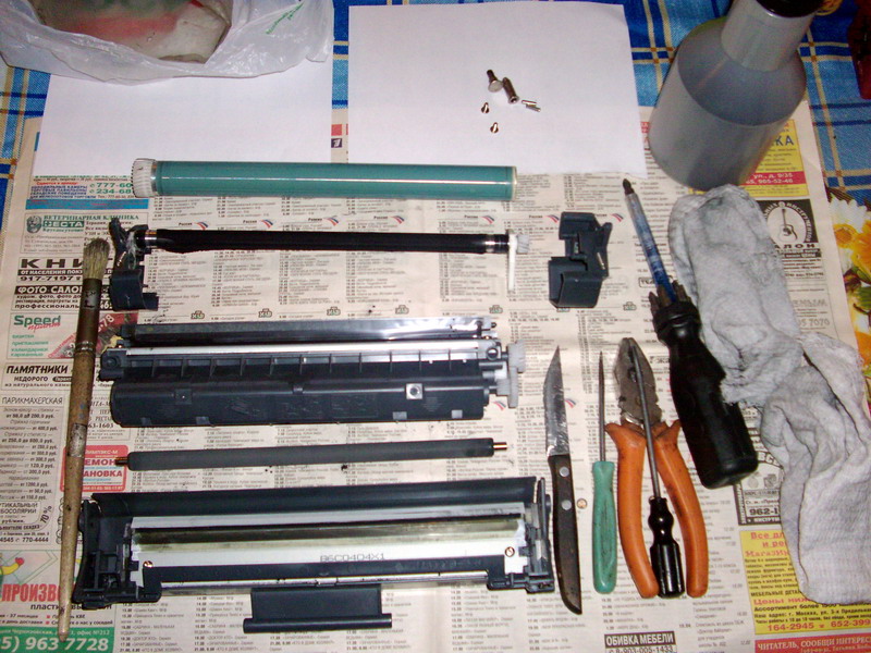 Газета, ножик, кисточка,банка с тонером…