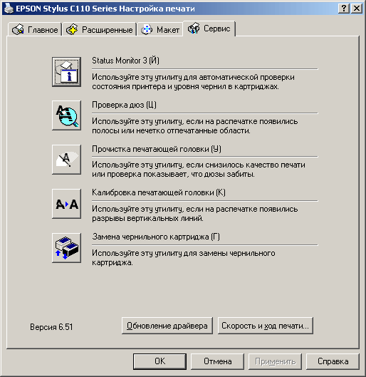 Драйвер C110 прост и лаконичен. Он состоит из четырех закладок, на которых отражены все возможные настройки устройства. Можно выбрать: режим печати, формат и тип носителя, ориентацию, управление и цветокоррекцию документа, а также необходимые сервисные утилиты.