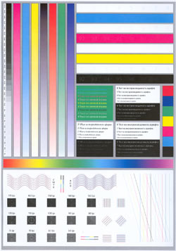 В плане цветопередачи к С3800 придраться сложно. Нет паразитных оттенков, градиентные растяжки пропечатаны гладко. Цвета сочные, насыщенные, без провалов и заливок. Единственное, к чему можно придраться, это небольшое несовмещение цветов — особенно оно заметно возле многоцветной растяжки. Это несовмещение появилось скорее всего из-за транспортировки принтера, хотя приведенный здесь тестовый отпечаток был выведен после трех калибровок аппарата.