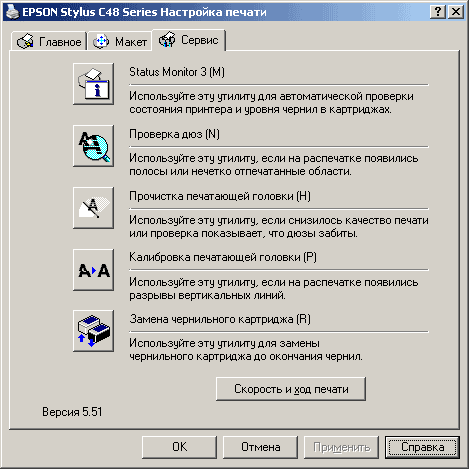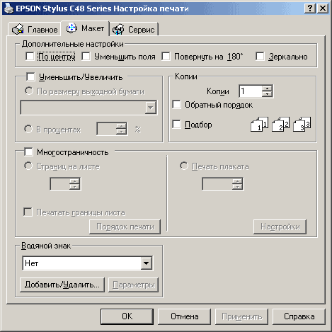 Драйвер принтера простой и понятный. Он имеет всего три вкладки: «главное», «макет» и «сервис». Из названий самих вкладок становится понятно, за что каждая из них отвечает. Останавливаться на каждой вкладке я не стану, приведу лишь скриншоты. Я установил последнюю доступную версию — 5.51, взятую с сайта производителя.