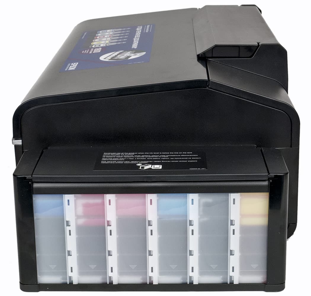 Чернила в Epson L805 используются те же, что и в целом ряде других шестицветных моделей «Фабрики печати», включая L800: водорастворимые, в пластиковых контейнерах-бутылочках по 70 мл.