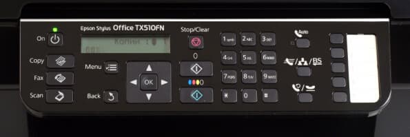На панели управления расположен двустрочный дисплей, клавиша включения и выключения устройства, выбор функции, блок меню и кнопки факса. Клавиши устройства сделаны (вопреки моде на сенсорное управление) из пластика, на ощупь отдаленно напоминающего резину.
