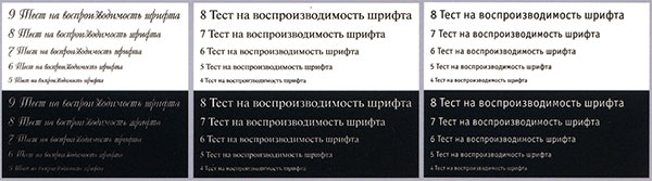 Читаемость шрифтовых образцов начинается с 4 кегля, для декоративных шрифтов с 5 кегля. При печати вывороткой шрифты без засечек уверенно читаются с 4 кегля, с засечками — с 5 кегля, для декоративных читается лишь 9-й кегль.
