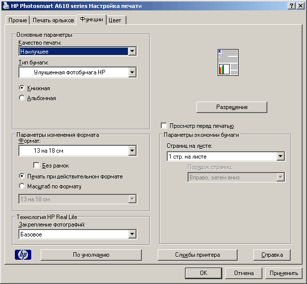 Все, что было сказано мною про установку и драйвер в предыдущей статье по HP Photosmart D7363, можно адресовать и к A618. Разница заключается лишь в ограничении максимального формата печати, составляющего 13х18 см. В остальном все осталось практически без изменений.