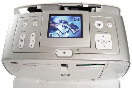 Всю верхнюю часть устройства можно без преувеличения назвать панелью управления. Одну треть ее занимает большой поворотный цветной ЖК-дисплей с диагональю 6,4 см. Слева от экрана находятся четыре кнопки: Menu, Delete и двухпозиционные (качели) Layout и Zoom. Справа расположились кнопки Print и Cancel, под ними — пятипозиционный джойстик. Под экраном находится большая овальная кнопка включения/выключения с индикатором состояния в виде светодиода.