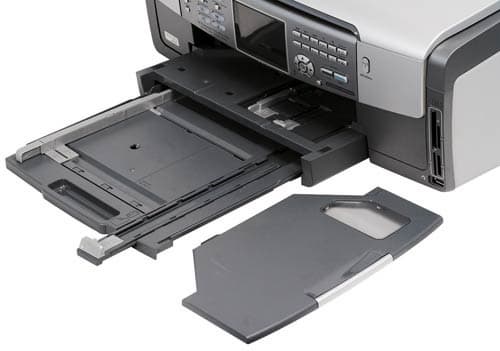 В самом низу расположились входной и выходной лотки, которые, по моему мнению, представляют достаточно сложную конструкцию. МФУ имеет два входных лотка для бумаги и других носителей. Основной входной лоток расположен ниже входного фотолотка. Как основной лоток, так и фотолоток имеют ограничители длины и ширины бумаги. Замыкает всю эту конструкцию выходной лоток, который имеет способность удлиняться.