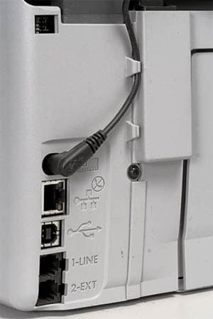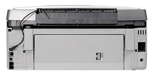 Необходимо отметить, что разъемы расположены достаточно удобно. Сзади расположились: высокоскоростной интерфейсный разъем USB 2.0, порт Ethernet с индикаторами используемый для подключения к проводной локальной сети, входной RJ 11 для факса и выходной на внешний телефон, сетевой разъем питания. Следует отметить, что компания-производитель удачно решила проблему размещения блока питания, который на этот раз «не болтается» снаружи, а расположился внутри устройства. Сзади находится и кабель питания лампы используемой для сканирования прозрачных оригиналов (слайдов и негативов).