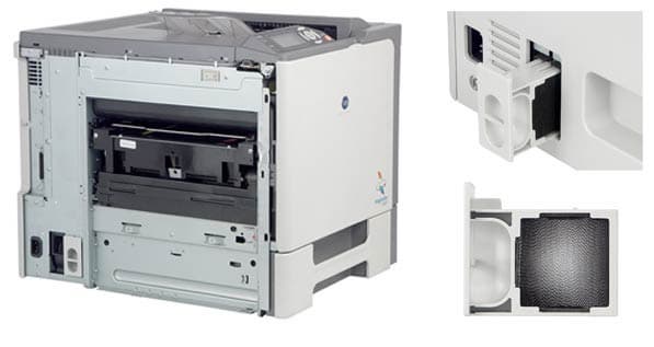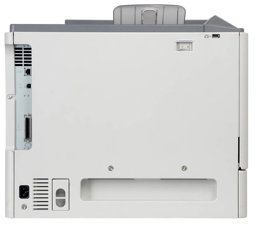 Упомянутая выше лента переноса извлекается для обслуживания с левой стороны печатающего устройства. Для этого необходимо отвернуть и снять декоративную панель. Там же неподалеку находится не совсем обычная деталь — сменный озоновый каталитический фильтр. Он уменьшает озонирование воздуха в процессе работы принтера и представляет собой сетчатый металлический брусок в поролоновом уплотнителе. На задней стенке, но тоже слева, расположены интерфейсные разъемы: параллельный порт, USB и Gigabit Ethernet.