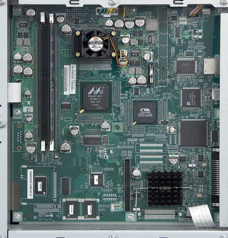Разумеется, в этом принтере самым интригующим компонентом является не механика, не эргономика и внешний вид, а именно контроллер. Плата зеленого текстолита скрывается под пластиковой обшивкой на задней панели принтера. Сердцем системы является мощный PowerPC G4 частотой 667 МГц(!). Совсем недавно такой чип считался нормальным для полноценной рабочей станции и до сих пор еще можно встретить в употреблении настольные и портативные компьютеры на этом процессоре. Более того, память принтера расширяется до 1 ГБ, а при установке в локальную сеть данные к принтеру могут поступать по очень быстрому интерфейсу Gigabit Ethernet (конечно, если только остальное сетевое оборудование поддерживает такой режим работы). Этот комплект достоин не принтера, но настоящей числомолотилки! Однако известно, что зря даже мухи не летают. И применение таких компонентов в принтере с рабочим разрешением «всего» 600 dpi тоже отнюдь не случайно.