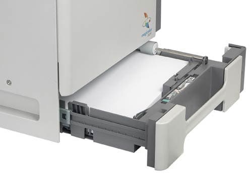 Как уже говорилось, все операции с расходниками пользователь будет совершать, открывая переднюю панель принтера. Отсюда нам становятся доступны картриджи с тонером и бачок с отработанным порошком. Итак, картриджи… Они огромны! Это совершенно монструозные изделия, у которых емкость с тонером расположена в верхней части, а фотовал находится снизу. Тонер перемещается к фотовалу по каналу внутри соединительной перемычки. К чему, спрашивается, такие сложности? Ответ: компактность печатного тракта. Дело в том, что в принтере используется дополнительная лента переноса изображения (сначала всеми четырьмя тонерами картинка строится на этой ленте и уже сразу в полноцветном виде переносится на бумагу). Такая схема тракта позволяет улучшить приводку отдельных цветов. Если не забывать, что современные лазерные устройства используют все более совершенные алгоритмы растрирования, зачастую с элементами стохастики, то такой подход выглядит логичным. Преследуя цель уменьшить габариты печатающего устройства, эту ленту можно было поставить под углом, картриджи по диагонали, а объем самих картриджей немного уменьшить. Но Konica-Minolta решила убить всех зайцев сразу. Лента пропущена «сквозь» картриджи. В итоге два функциональных блока совмещены в объеме одного без ущерба для емкости тонера, однако — с ощутимым усложнением конструкции. Это ставит вопрос о качестве отпечатков на исходе тонера — насколько эффективно расходуется порошок, и не появляются ли полосы и артефакты? Я не претендую на истину в последней инстанции, но могу однозначно заявить, что принтер пришел к нам на тесты с почти пустыми картриджами. Тем не менее, никакого отрицательного влияния конструкции картриджей на качество печати наши тесты не обнаружили.