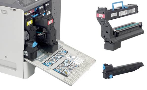 Несмотря на замысловатость конструкции, картриджи меняются очень просто. Каждый цвет снабжен индивидуальными выступами-ключами, исключающими неправильную установку, и ручкой (без нее эту махину будет просто не за что ухватить). Что касается бачка для отработанного тонера, то эта деталь сама по себе весьма бесхитростна, поэтому трудно сказать о ней что-то особенное. Единственно — лючок, запирающий емкость и не дающий рассыпаться порошку, одновременно является замком, без поворота которого емкость из принтера не вынимается (соответственно, шансы рассыпать тонер по всей комнате заметно уменьшены). Мелочь, а приятно.