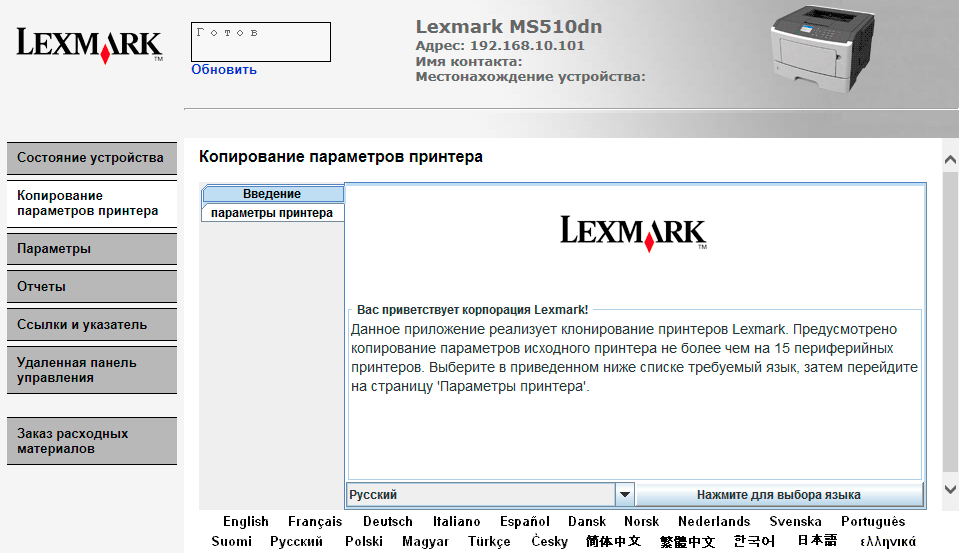 | Языки описания страниц (стандартные) | Эмуляция PCL 5e Эмуляция PCL 6 Эмуляция PostScript 3 Microsoft XPS (XML Paper Specification) Эмуляция PDF 1.7 PPDS, Direct Image, AirPrint™ |