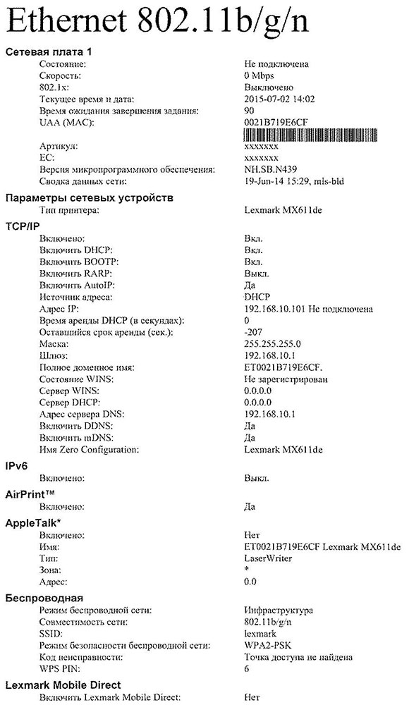 Примеры распечаток отчетов о состоянии МФУ