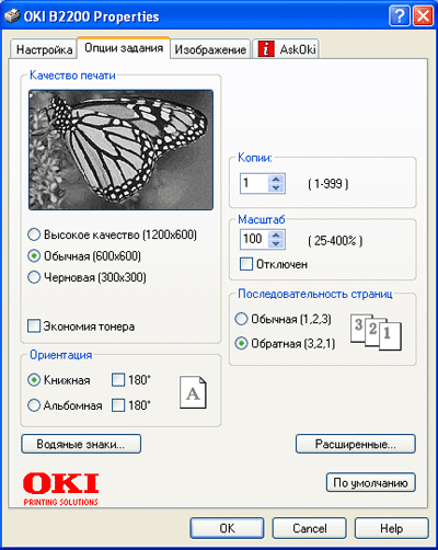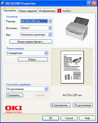 Драйвер В2200 содержит четыре вкладки — основные настройки печати, параметры задания и печать изображений, последняя называется Ask OKI, с нее можно перейти на интернет-страницу производителя.