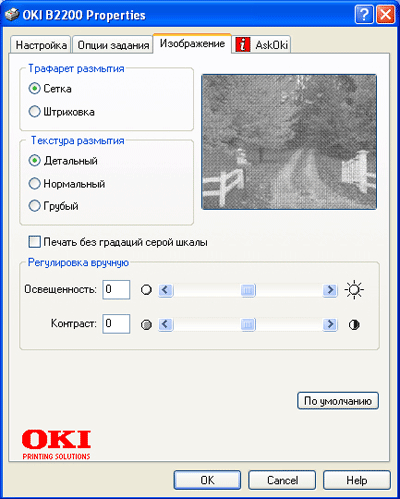 Во вкладке «Изображение» можно подобрать сочетание параметров для улучшения качества печати в каждом конкретном случае. Сглаживание переходов градаций серого может передаваться штриховыми линиями или точечной сеткой, размер точек регулируется по трем значениям. Кроме того, эффекты градации можно напечатать просто черным цветом, без сглаживания переходов. Яркость и контрастность регулируются двумя движками.