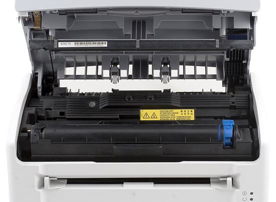 Крышка открывается нажатием кнопки на ее передней грани. Прямо под крышкой находится тонер-картридж с фотобарабаном. Позади него — печка. Расходники вынимаются легко, они не закреплены никакими защелками, но устанавливаются плотно. На внутренней стороне крышки нет инструкции по извлечению картриджа, но и без нее процедура проделывается без проблем. Чтобы извлечь застрявшую бумагу, нужно вынуть картридж, дальше все должно быть просто — места внутри принтера достаточно, чтобы можно было ухватиться за край бумаги. Более подробно описать сложно, поскольку во время тестирования замятий бумаги не случалось.