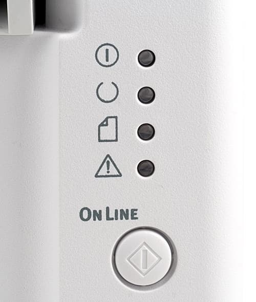 Кнопка включения расположена в левой части передней панели. Кнопка большая, легко нажимается, правда, ход у нее непривычно маленький, и в первое время не сразу понимаешь — нажата она или нет. На правой стороне находятся четыре светодиодных индикатора и кнопка Online. Эта кнопка переключает принтер в рабочий или автономный режим, подает сигнал продолжения работы после устранения замятия бумаги и удаляет текущее задание — для этого ее надо удерживать 5 секунд.