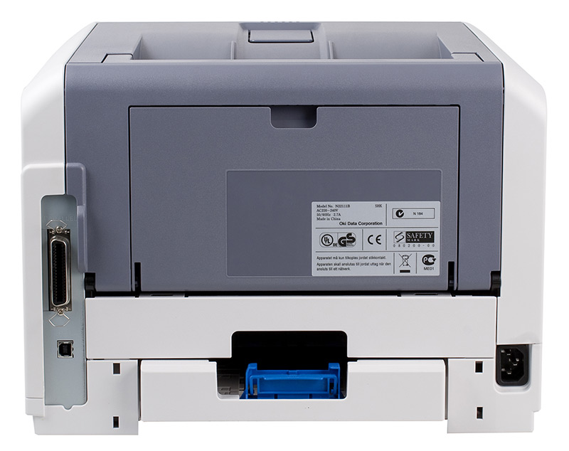 Принтер оформлен в типичном для OKI стиле: бело-серый параллелепипед неброского вида с закругленными углами – воплощение привычного офисного дизайна последних лет. Габариты принтера средние для техники такого класса. Загрузка бумаги производится спереди, в один из двух лотков (обычный автоматический плюс универсальный), а выходной лоток расположен сверху.