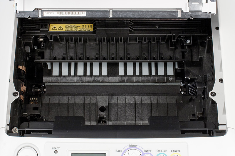 Все производители принтеров последние годы уделяют много внимания компоновке узлов. B430d в этом плане не оригинален, что отражается в его форме и размерах, но благодаря этому у пользователя есть удобный доступ к расходным материалам и печатному тракту. Светодиодная линейка расположена на крышке принтера, от которой идет шлейф проводников. При закрытии верхней крышки линейка подходит вплотную к фотобарабану через специальную щель в картридже, прикрытую черной шторкой. Сам картридж состоит из двух частей: емкость для тонера можно отсоединить и заменить отдельно.