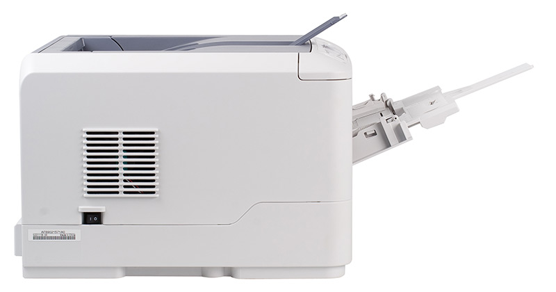 С левой стороны обнаруживаем кнопку питания и вентиляционную решетку, справа находится лючок, открывающий доступ к разъему расширения памяти. Все интерфейсные разъемы, разъем питания и технологические узлы расположены сзади устройства. Под технологическими узлами я подразумеваю модуль двусторонней печати и крышку прямого тракта – если открыть её и подавать бумагу с универсального лотка, то листы будут отпечатаны без лишних изгибов и выброшены не на верхний лоток, а сзади принтера.
