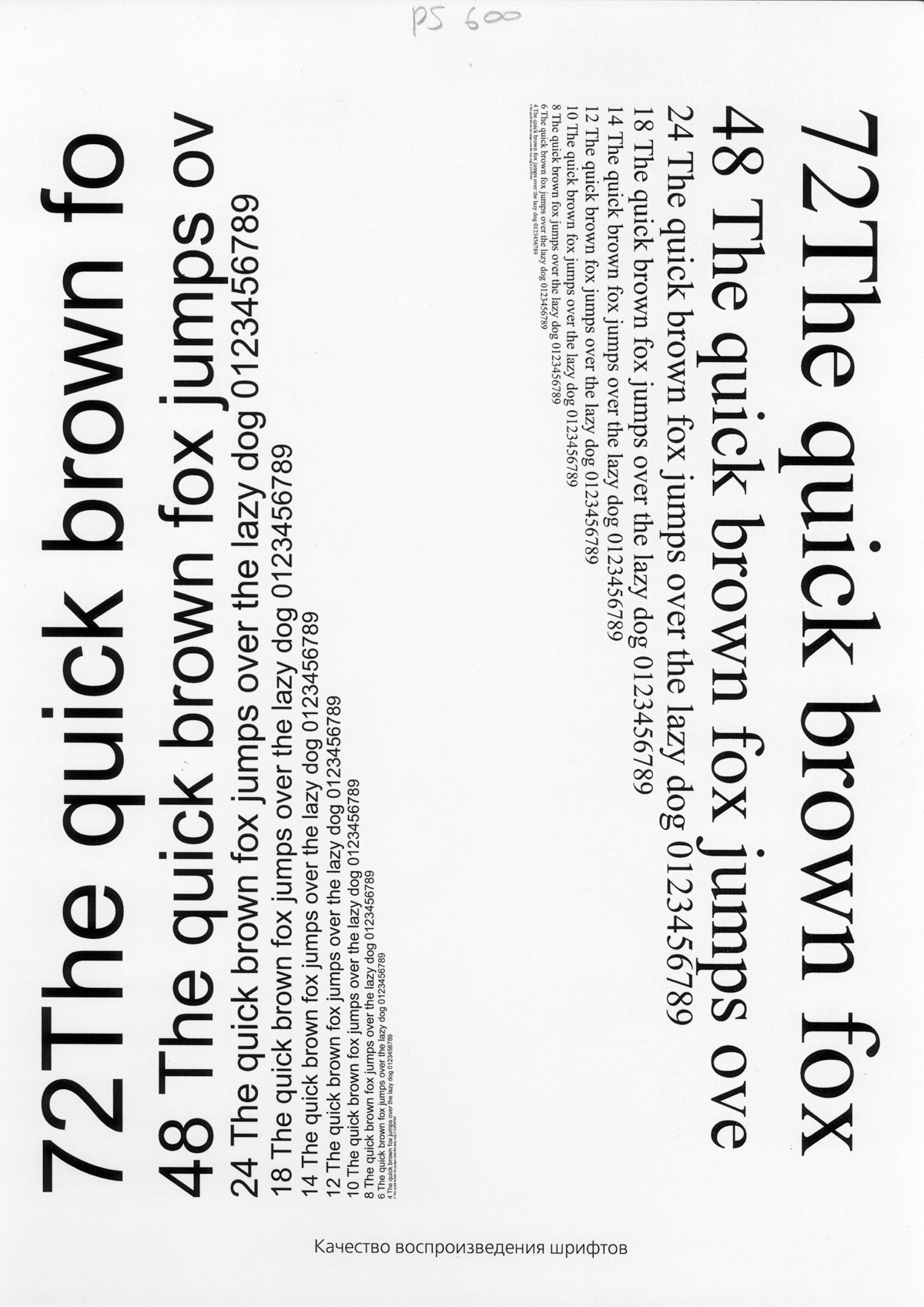 Безусловный лидер по качеству отпечатков – PostScript-драйвер. В режиме «PostScript, 1200dpi» принтер выдает очень четкий текст, читаемый вплоть до кегля в 2pt, «сочные» черные плашки и полный диапазон оттенков серого (от 1% до 98%) с гладкими градиентами. Воспроизводимая линиатура высока и составила 160lpi. Переход на разрешение 600dpi сказывается, по сути, только на растровых картинках: из-за уменьшения количества градаций становятся хорошо виды паттерны полутонов на градиентах и фотографиях. Но текст продолжает оставаться читаемым до самых мелких кеглей, хотя четкость 2-пунктового шрифта снижается, а линиатура падает до 100lpi.