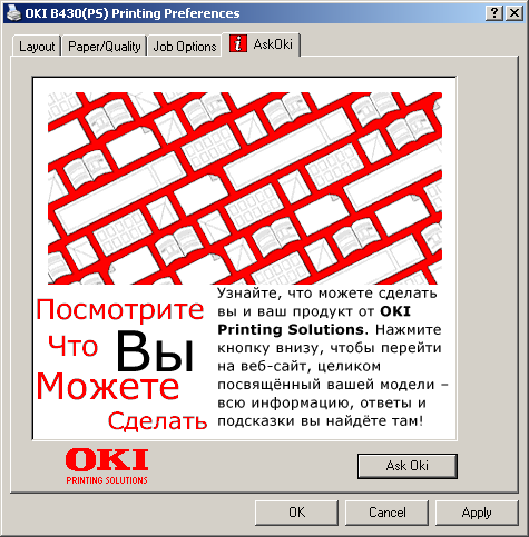 PS-драйвер выглядит гораздо проще: доступных разрешений печати всего два, 1200dpi и 600dpi (в PCL есть еще и 300dpi), можно включить экономию тонера и улучшенное воспроизведение тонких линий. Собственно, это и всё. Правда, в отличие от PCL-режима здесь доступны две специальные опции: вывод изображения зеркалом и негативом. Казалось-бы, в обывательском смысле PCL будет предпочтительней, но немного забегая вперед, скажу, что с такой несравнимой скудостью настроек PS-драйвер обеспечивал в наших тестах на порядок более качественные отпечатки, при этом работал почти в два раза быстрее.