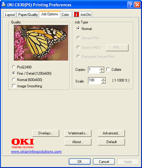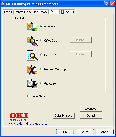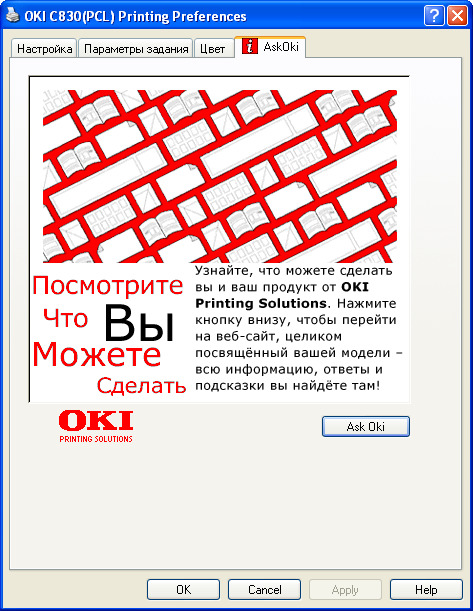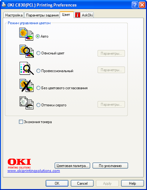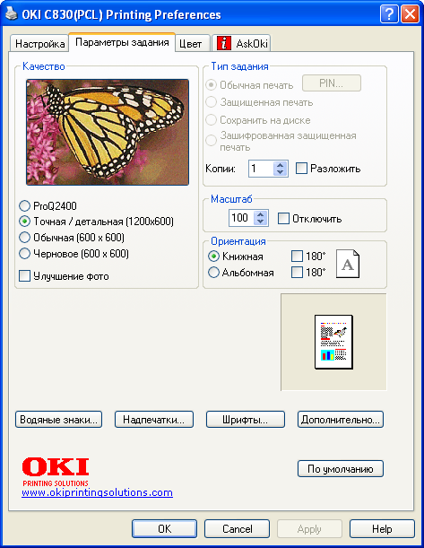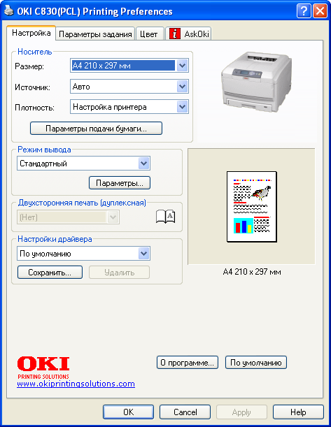 Что очень понравилось в программном обеспечении от OKI, так это гибкость. Кроме собственно драйвера, на сайте производителя доступны утилиты, расширяющие функционал принтера (здесь вам и тонкий тюнинг цветопередачи, коррекция кривых растискивания, вывод зеркальных и негативных форм и многое другое). Так вот, гибкость проявляется в том, что установленная утилита работает не как отдельное приложение, а встраивается в драйвер (то есть там появляется дополнительная вкладка). При таком модульном подходе любое функциональное расширение будет доступно из любого приложения, независимо от того, с каким типом документов оно работает.