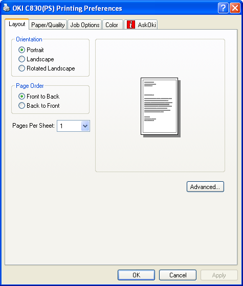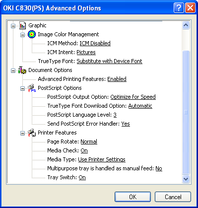 Как всякий «большой» принтер, OKI C830 дает возможность воспользоваться эмуляцией различных языков и протоколов: PostScript 3, PCL 5c, PCL XL, PCL 6, HP-GL, Epson FX а также IBM Pro Printer III XL. На тестовый стенд устанавливались драйвера PS 3 и PCL 6.