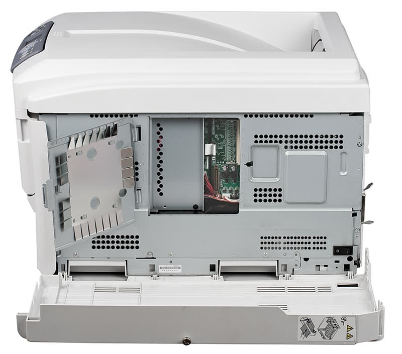 С правой стороны, под облицовкой, скрывается лючок доступа к разъемам расширения. Модель C830 допускает расширение памяти до 768 МБ (штатные 256 МБ и модуль 512 МБ), а также установку опционального жесткого диска. Как водится, кроме этих опций доступны также дополнительные лотки и напольная тумба, а также модуль двусторонней печати.