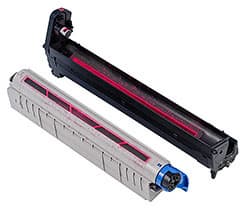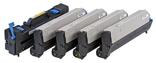 Картриджи типового для OKI дизайна допускают раздельную замену фотобарабана и тубы с тонером. Заявленный ресурс барабана превышает ресурс тубы более, чем в два раза: 20 000 и 8 000 страниц соответственно. Комплектные картриджи, как обычно, содержат тонера только на 2 000 страниц.
