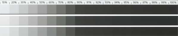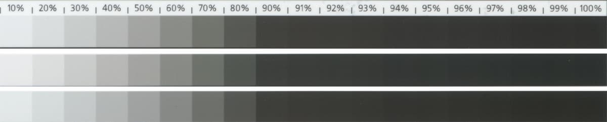 Мы видим, что плотного, стопроцентного черного цвета, нет ни на одном отпечатке. На шкале нейтральных плотностей, стопроцентному черному соответствует промежуток от 93 до 95 процентов. Но наиболее нейтральным, выглядит результат на бумаге Canon. На ней, на черных плашках, не заметно паразитных примесей, чего нельзя сказать о бумагах Goodwill и Lomond. На бумаге Goodwill, результат более холодный, а на бумаге Lomond напротив теплый. Заметно это только при непосредственном сравнении, что называется полоса к полосе. В остальном, отличий практически нет.