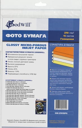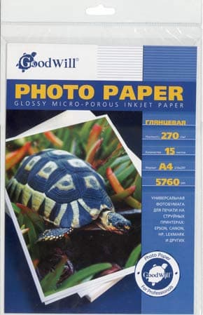 Бумага Goodwill Photo Paper Glossy Micro-Porous Inkjet 270г/м2 A4 поставляется в полиэтиленовой прозрачной папке, в количестве 15 листов.