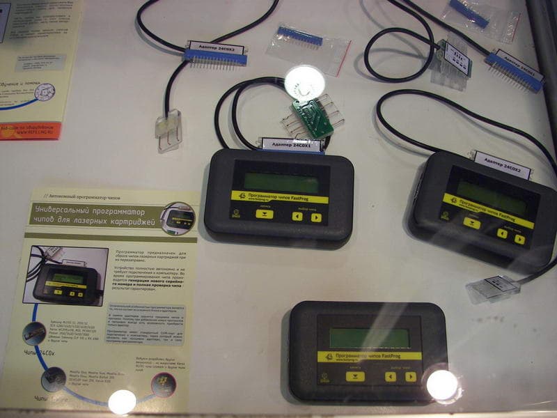 А вот и способ решения чипованных проблем с картриджами. Простая, но важная коробочка обнуляет чипы многих производителей. Избавляя тем самым потребителей от необходимости их замены. Стоит такая «игрушка» дороже одного чипа в несколько раз, но это экономически оправдано, если количество применений этого достижения больше чем 1 раз за весь срок службы.