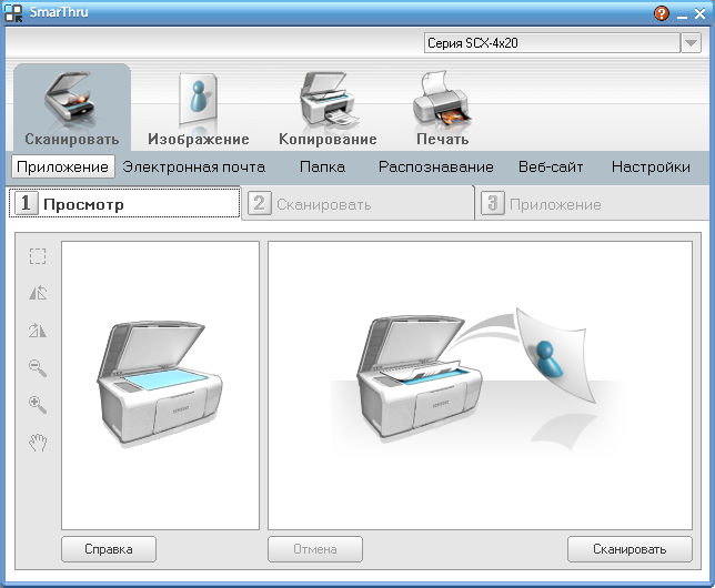 - сканирование при помощи входящей в комплект поставки программы управления МФУ "Samsung SmarThru";
