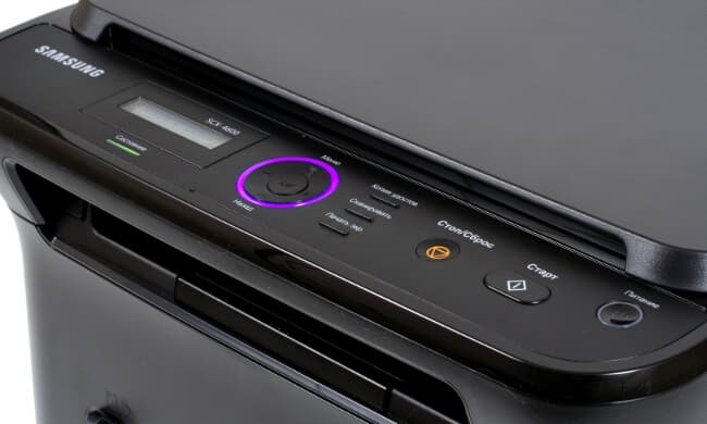 Панель управления МФУ расположена строго горизонтально, без какого-либо наклона. Кнопок на ней имеется допустимый минимум: навипад с клавишей выбора, три функциональные кнопки, отмена и старт задания, а также клавиша питания.