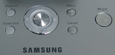 На панели управления, кнопок, отвечающих за работу и настройку принтера, всего шесть. Одна из них расположена в центре четырехпозиционного джойстика и служит для подтверждения выбранных в меню настроек. Далее две кнопки зуммирования (Zoom In, Zoom Out), кнопка вызова меню (Menu), отмена (Cancel) и большая кнопка Print. Как я уже говорил выше, они металлические, с упругим нажатием, но при этом прилагать силы совсем не требуется. Случайные касания не приводят ровным счетом ни к чему.