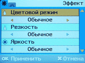 - Цветовой режим (обычное, ч/б, сепия, ретро, яркое, красное, зеленое, синее, теплее, холоднее, меньше синего, меньше желтого).
