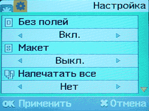 Меню принтера представлено в виде двух закладок. Если карта памяти не установлена в кард-ридер устройства, то мы имеем доступ только к определению языка интерфейса (русский поддерживается). При установке карты становятся доступны и остальные опции меню. У нас появляется возможность определить эффекты, используемые при печати, и настроить макет.