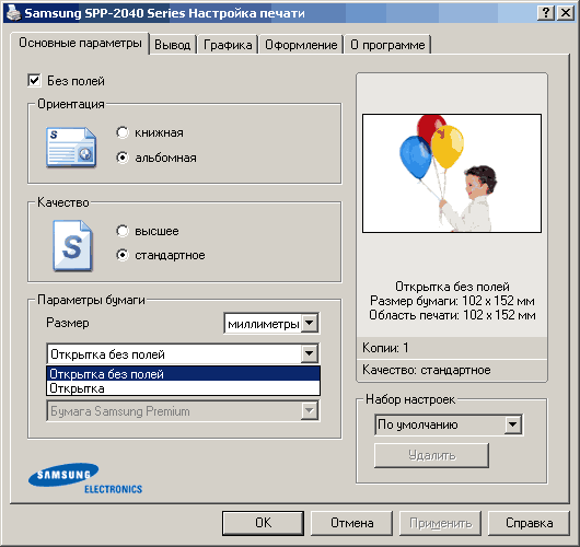 Надо признать, драйвер принтера очень порадовал. Он состоит из пяти закладок и помимо основных установок содержит вкладку «Оформление». Используя ее, можно быстро подобрать рамку к фотографии и при необходимости красиво оформить подпись, меняя шрифт, начертание, цвет и подобрать оттенки.