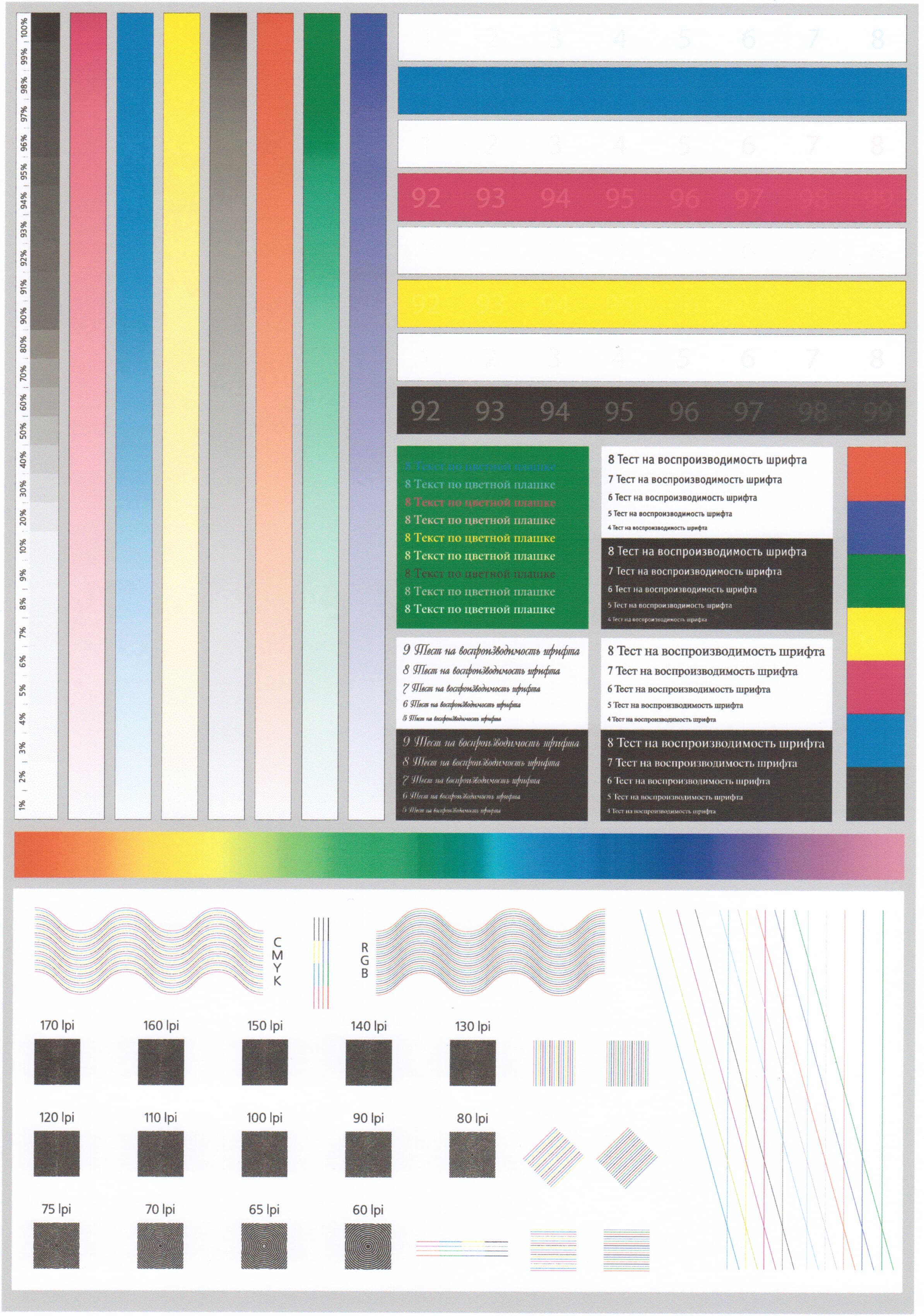 В тестовой полосе единственное, к чему можно было бы придраться — зто зернистость изображения: при близком рассмотрении вся страница распадается на множество точек. Это обстоятельство повлияло и на качество воспроизведения волнистых цветных линий: они отчасти стали не столько линиями, сколько «пунктирами». Зато градиентные переходы на странице оказались равномерными и гладкими.