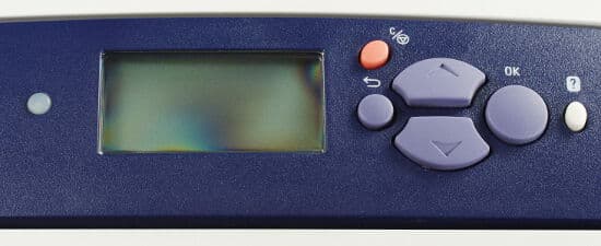 Панель управления у Phaser 8860 предполагает только первичную техническую настройку и получение данных о его текущем состоянии, а потому содержит лишь необходимый набор клавиш и небольшой монохромный дисплей. Кнопки здесь представлены парой стрелок навигации (вверх и вниз), кнопкой возврата, «ОК», а также клавишей отмены задания и вызова справки. Дисплей имеет яркую голубую подсветку и может отображать до шести строк.