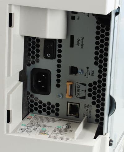 Внешний осмотр принтера заканчивается на его задней панели, где находится блок разъемов: для провода питания, USB-шнура и сетевого кабеля. Суда же спрятали и клавишу отключения устройства, дабы никто случайно не нажал ее, не подумав.