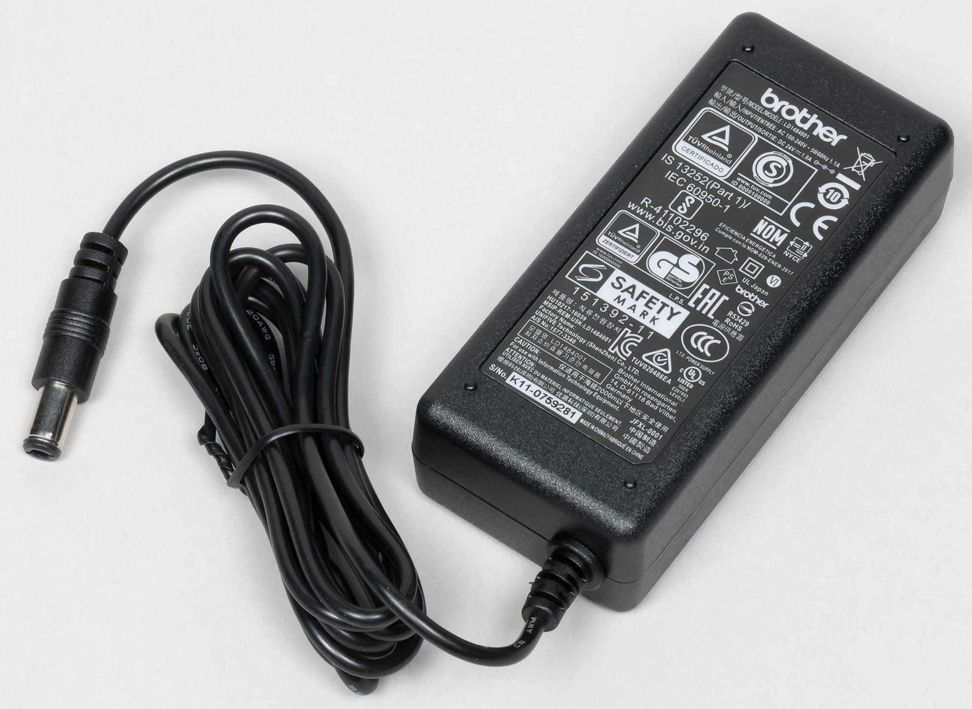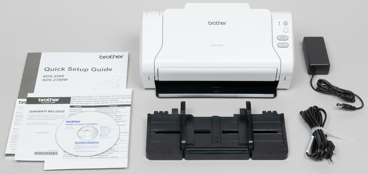 Помимо самого аппарата и адаптера питания (вход AC 100—240 В, 50/60 Гц, 1,1 А; выход DC 24 В, 1,9 А), в коробке находятся съемный подающий лоток, а также печатная документация и компакт-диск с ПО.