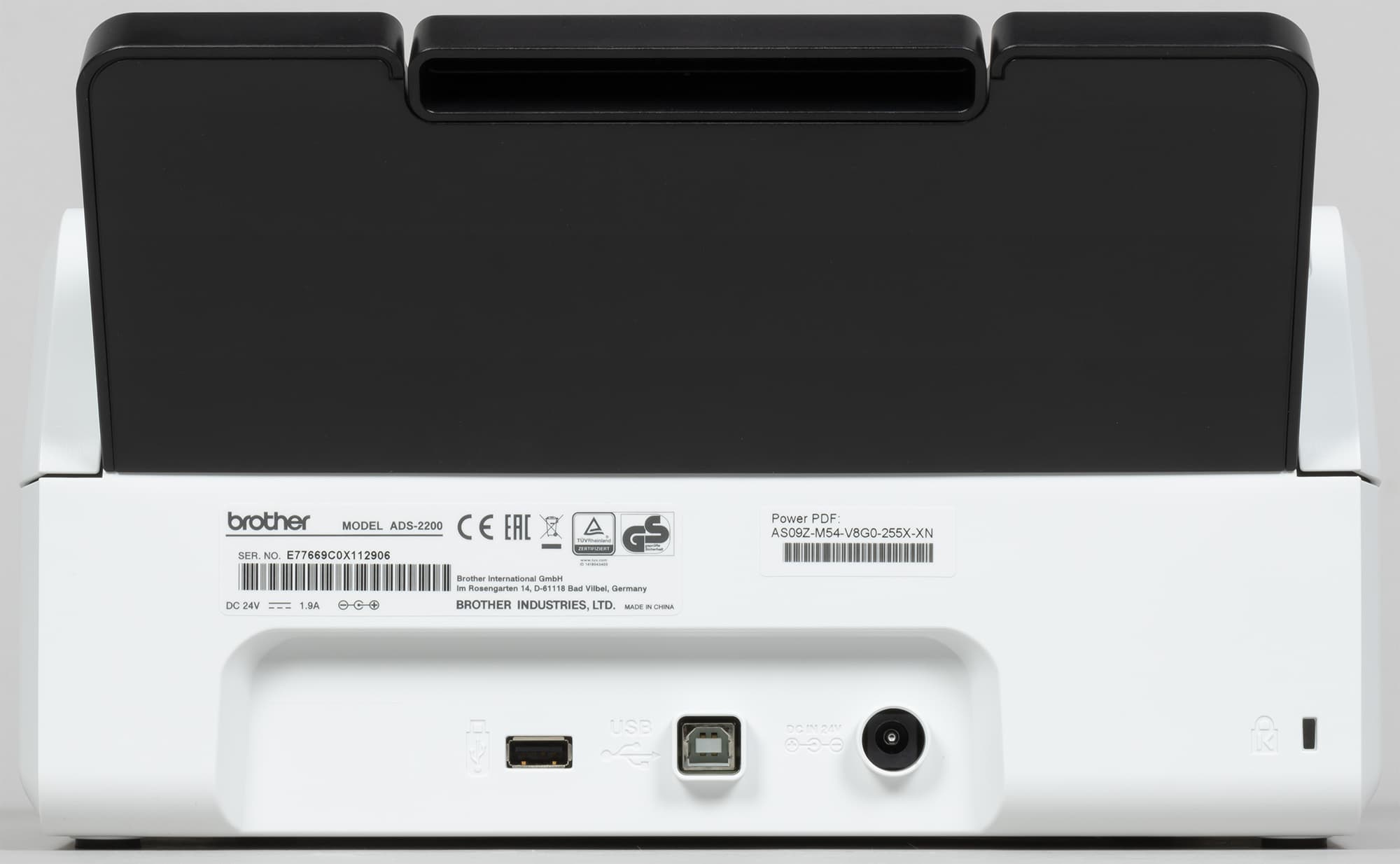 Сзади внизу расположены разъемы — питания, USB type B (female) для локального подключения к компьютеру и хост-порт USB type A (female) для съемных запоминающих устройств с целью сохранения на них отсканированных документов без использования компьютера. Все они находятся «в тени» подающего лотка, а потому подключенные кабели и носители не будут увеличивать площадь, занимаемую сканером.